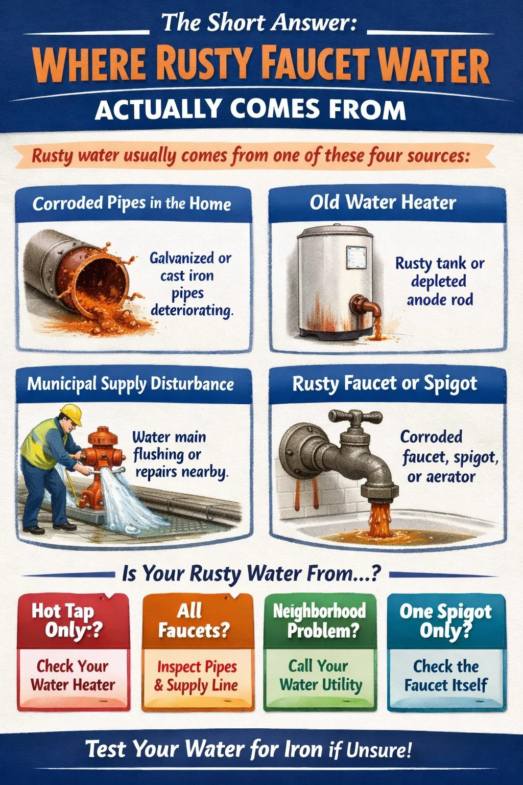 A csapokból származó rozsdás vizet szinte mindig a négy forrás valamelyike okozza: korrodált vas- vagy acélcsövek otthonában, romló vízmelegítő, üledékzavar a települési ellátó vezetékben, vagy oxidált csap vagy szerelvény a szállítás helyén. A narancssárga, barna vagy vöröses árnyalat vas-oxid – rozsda –, amely vagy leválik a csövek belsejéből, és bejutott a vízfolyásba, vagy közvetlenül a vízben oldódik, miközben az öregedő infrastruktúrán halad keresztül.