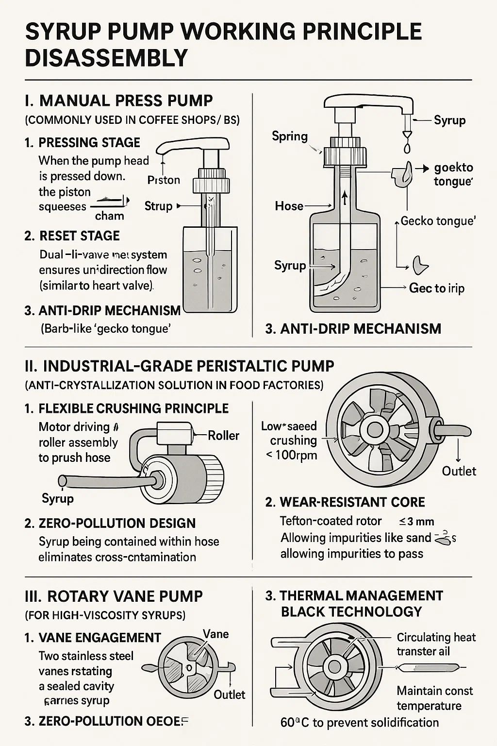 2. Zero-Pollution Design: A szirup csak az élelmiszer-minőségű tömlővel érintkezik (a fémrészeket elkerülve) → Keresztszennyeződés megszüntetése.